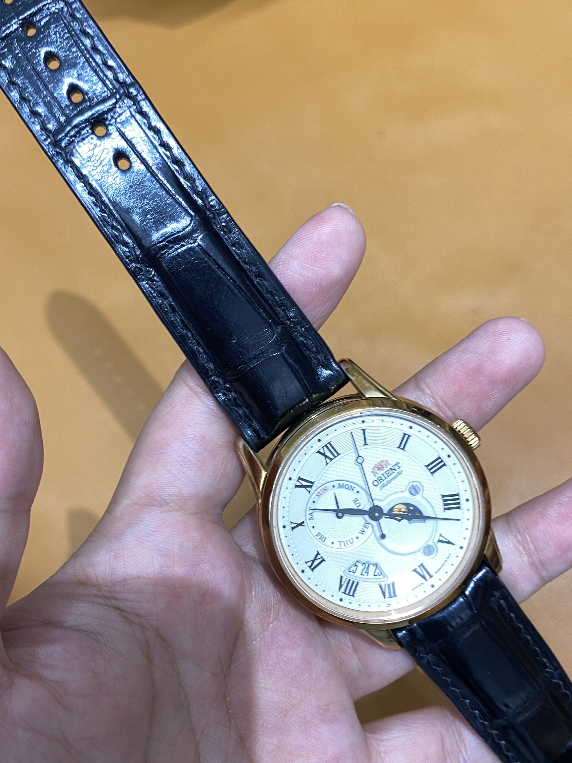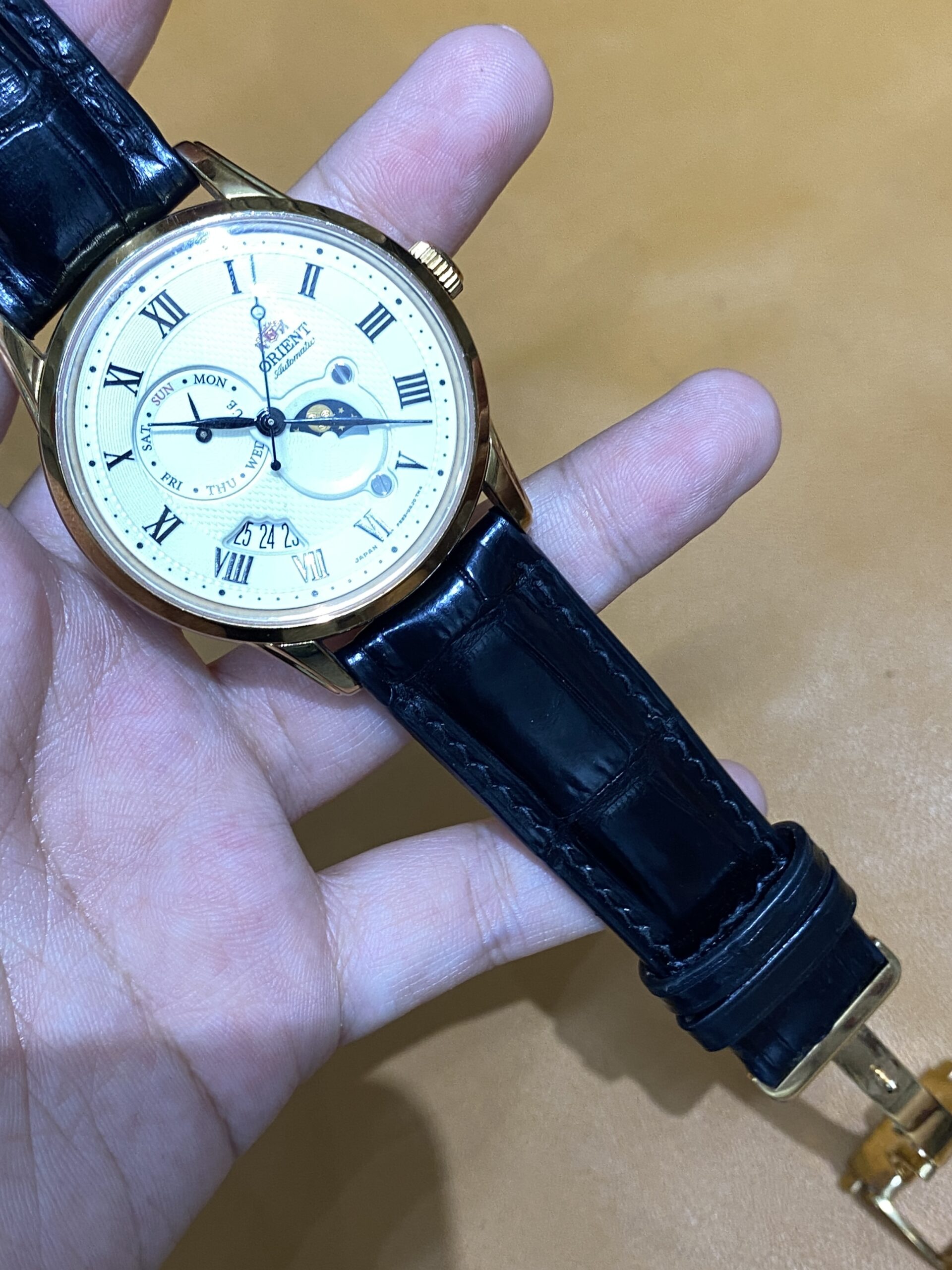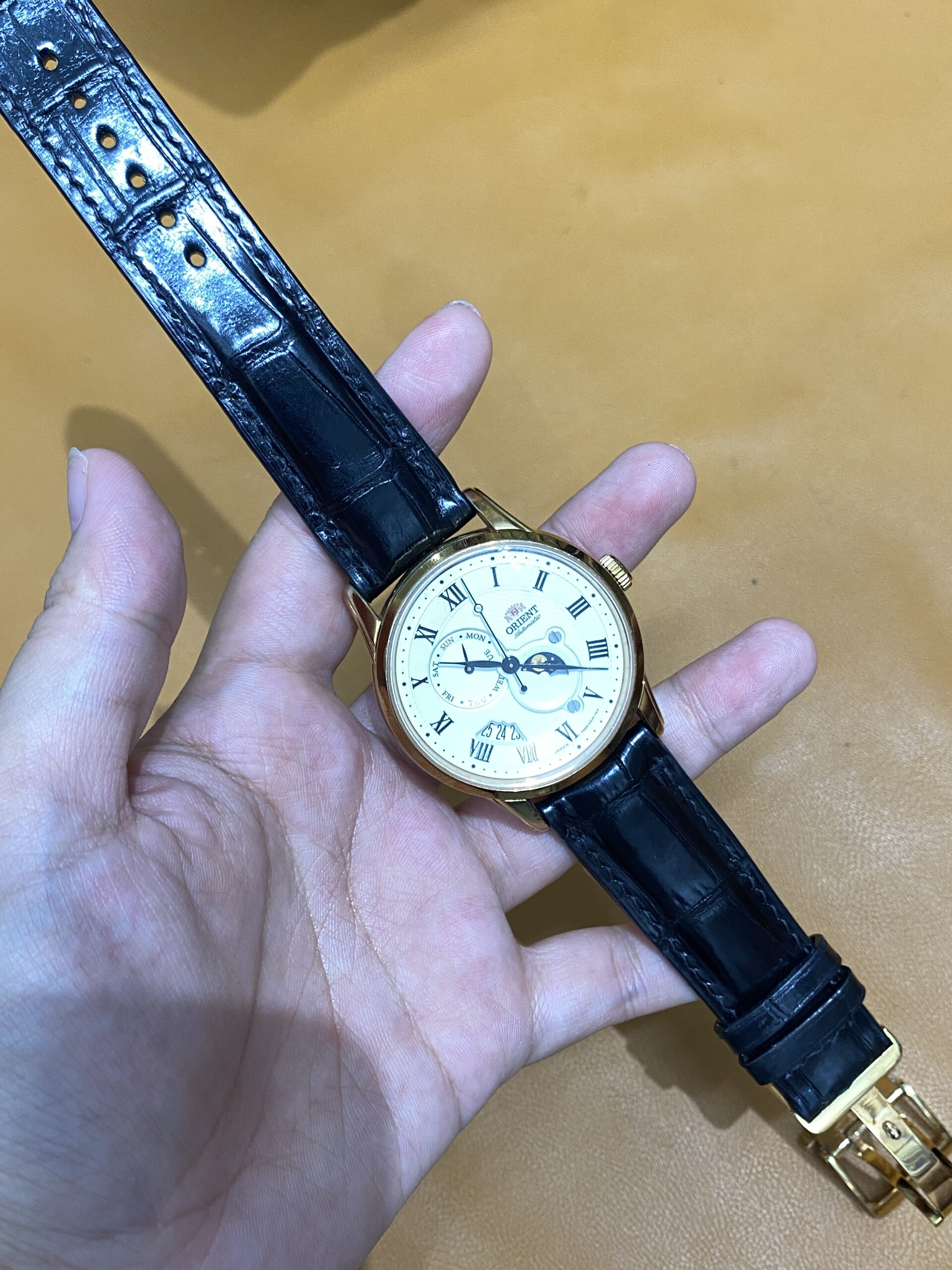 Dây cá sấu đen cho Đồng Hồ Orient Sun And Moon Gen 3 Rose RA-AK0007S10B size 22-20