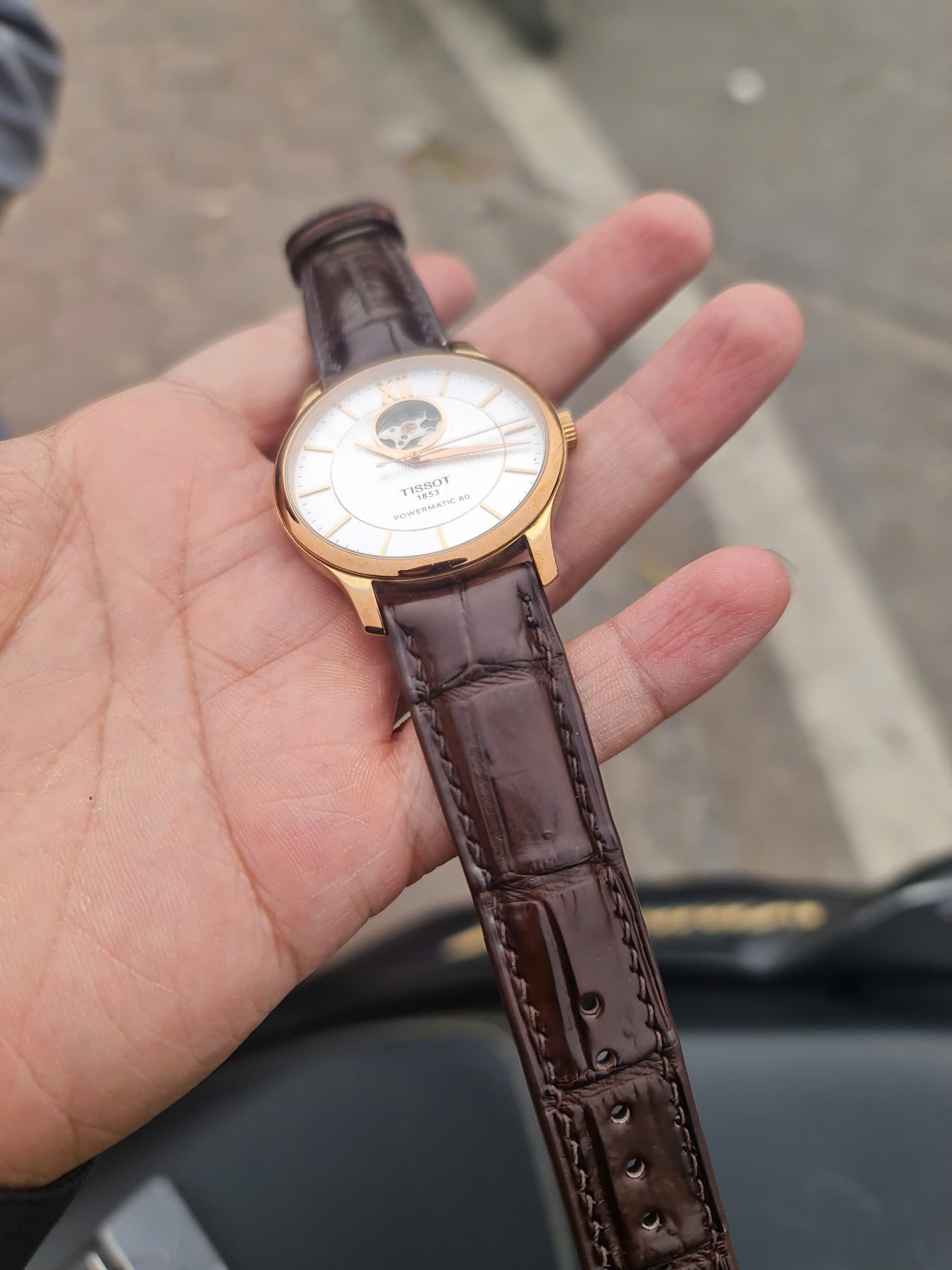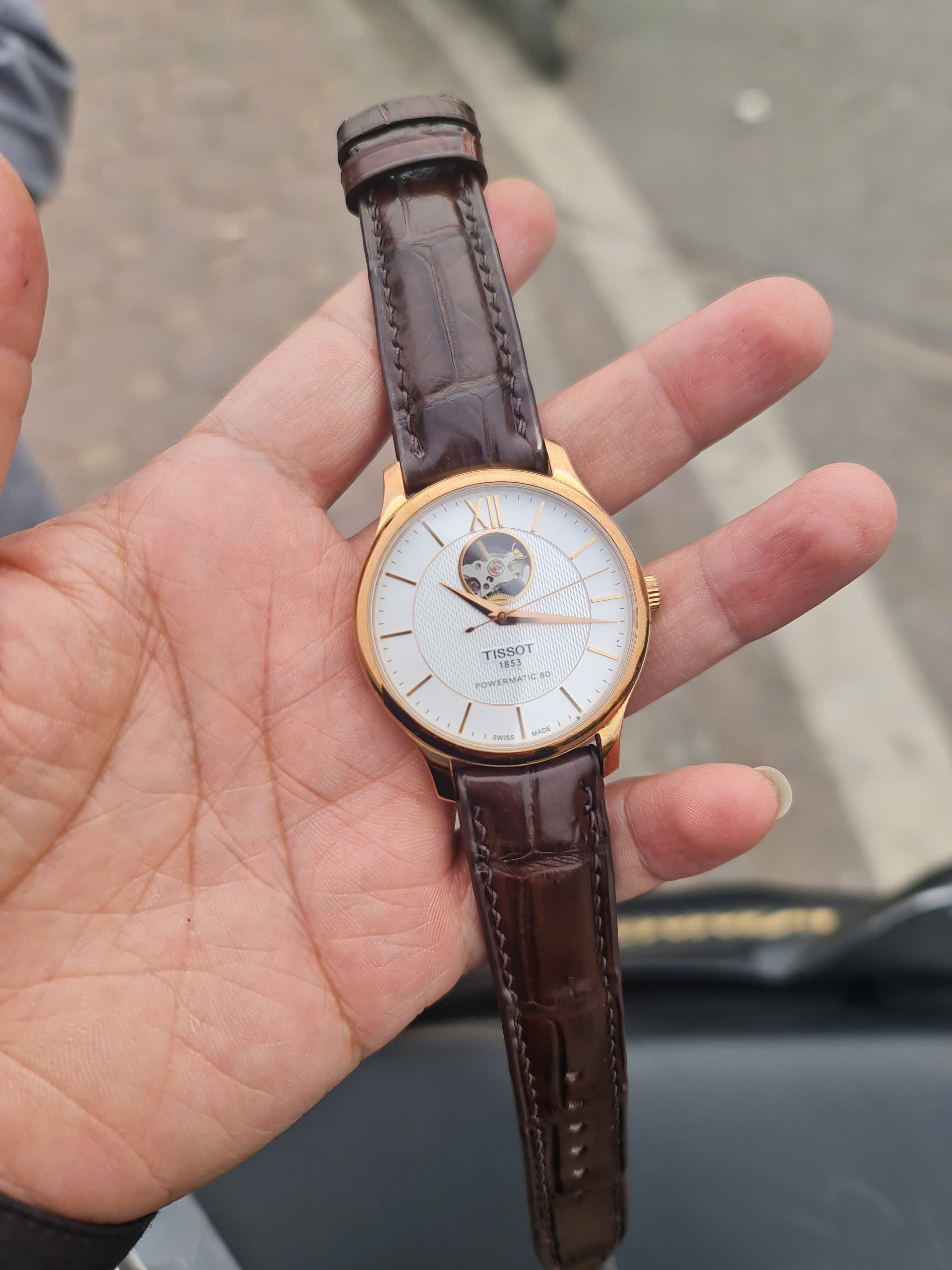 Dây da nâu đất khâu máy đồng hồ Tissot Powermatic T063.907.36.038.00
